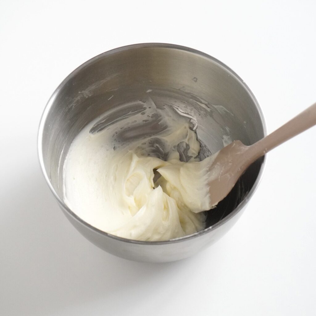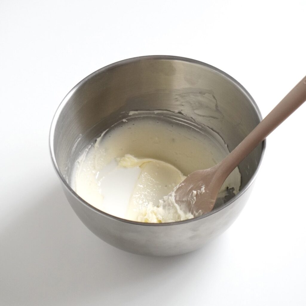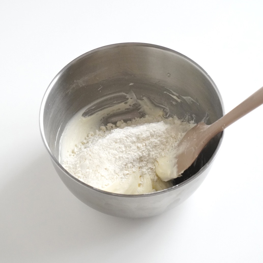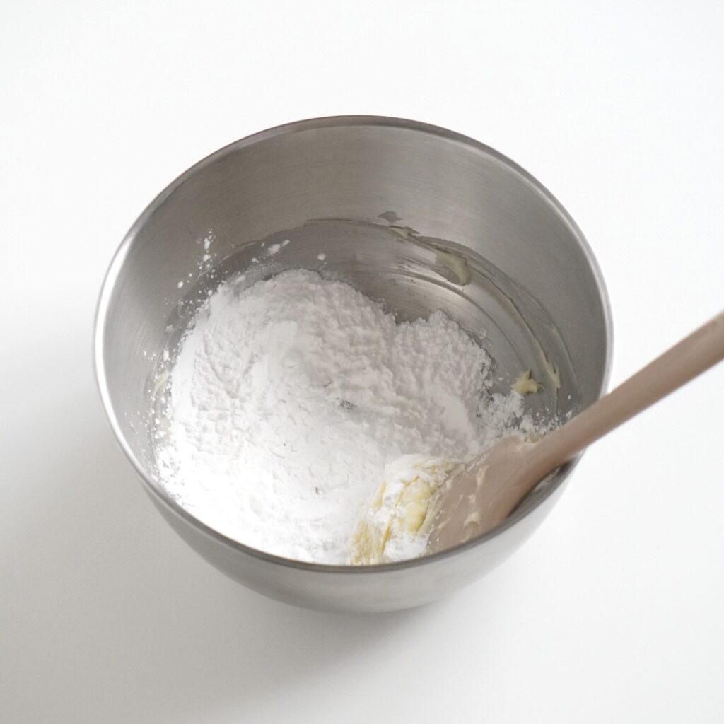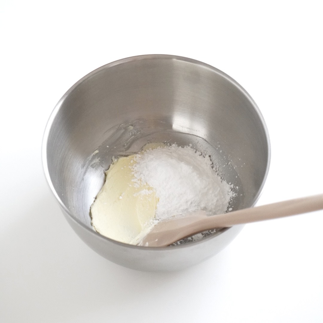 ❶ボウルにやわらかくした無塩バターと粉糖を入れて混ぜる。