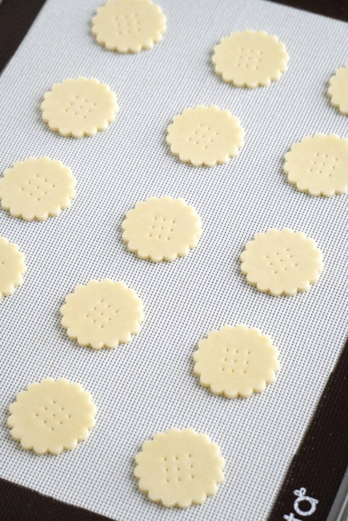 ❻型に抜いてシルパンにのせる。フォークで模様をかく。