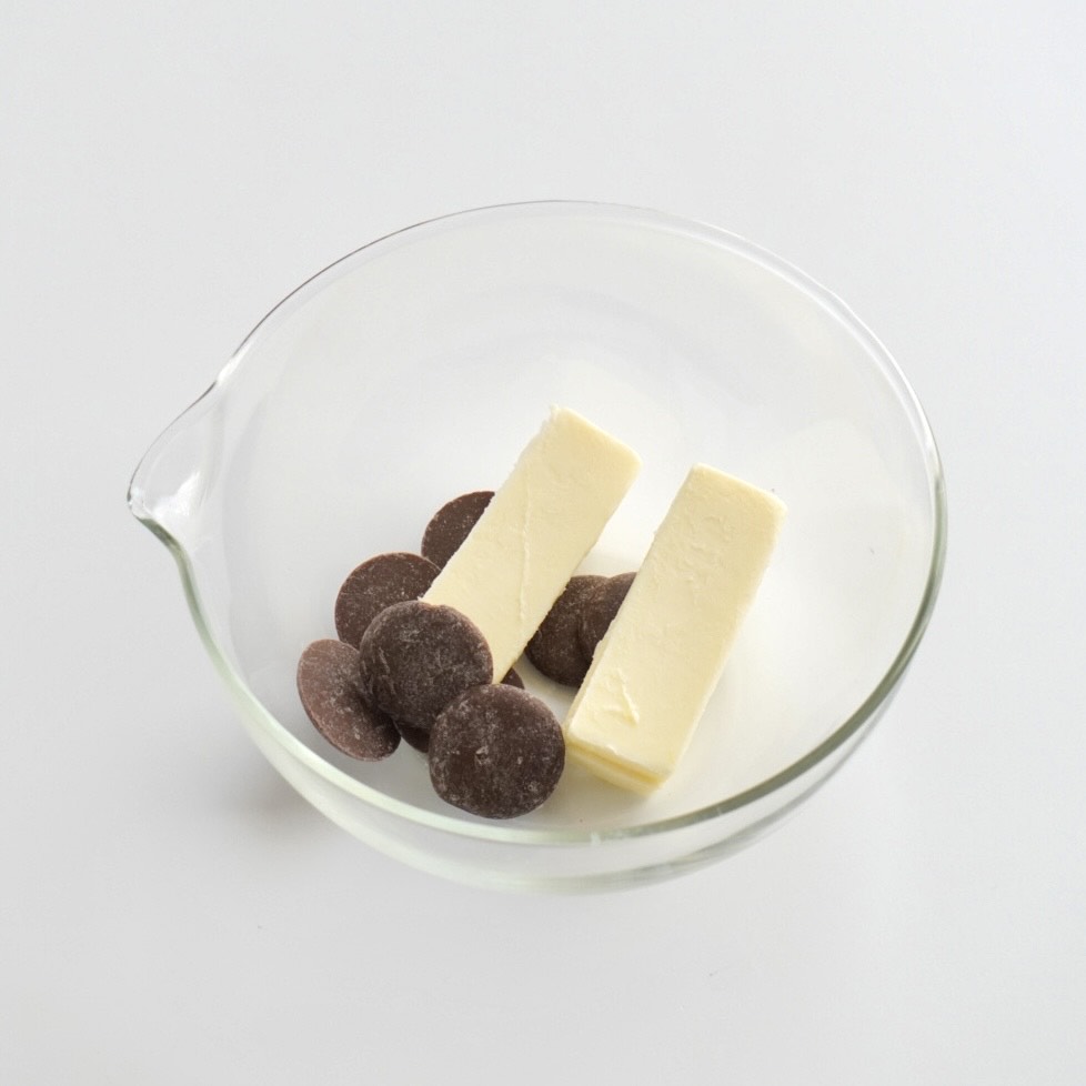 ❶無塩バターとチョコレートを湯せんにかけ溶かしておく。(約50度で使用する。)