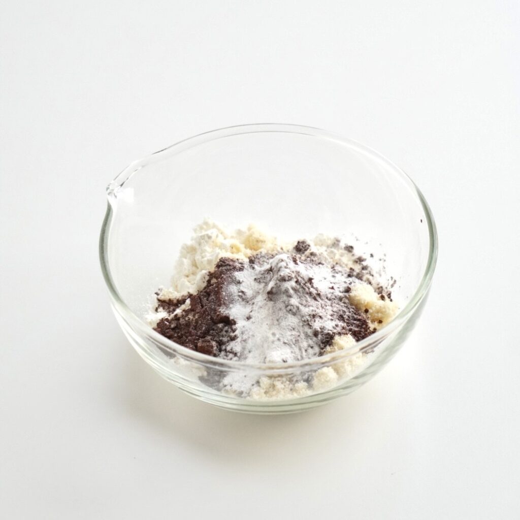 ❷薄力粉・アーモンドプードル・ココアパウダー・ベーキングパウダーを合わせてふるっておく。(A)