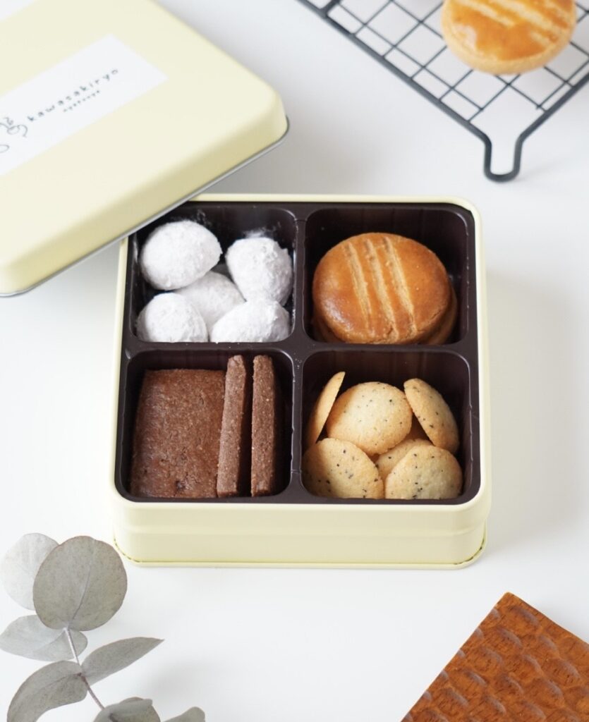 ▲見本のお菓子は仕切り付きのクッキー缶に入れてお送りします。