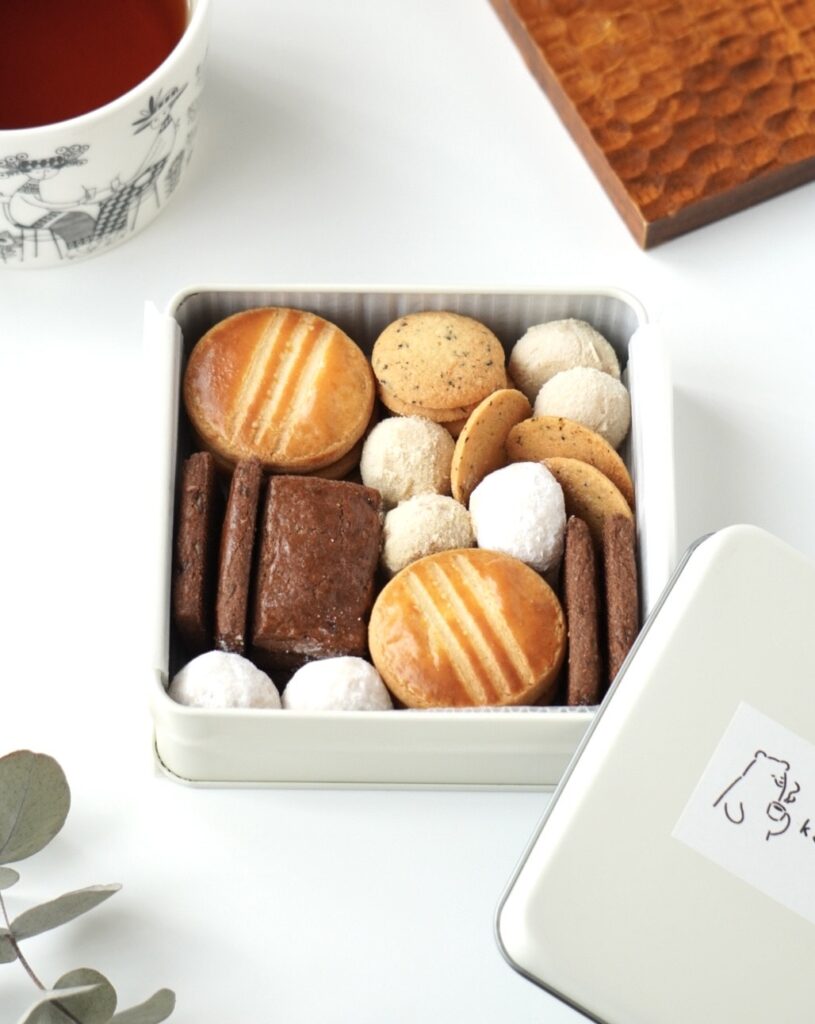 定番で人気のお菓子である「スノーボール」と「サブレ」、「ラングドシャ」を詰め込んだクッキー缶です。すべて小麦粉ではなく、“米粉“を使って作ります。
